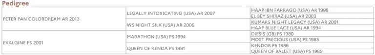 Peter Pan Colordream, le père de Louxor, est un très bel étalon arabe. Inconnu du sport, il a surtout été utilisé en tant que reproducteur pour sa très belle robe noire et le fait qu’il apport énormément de blanc à sa production.